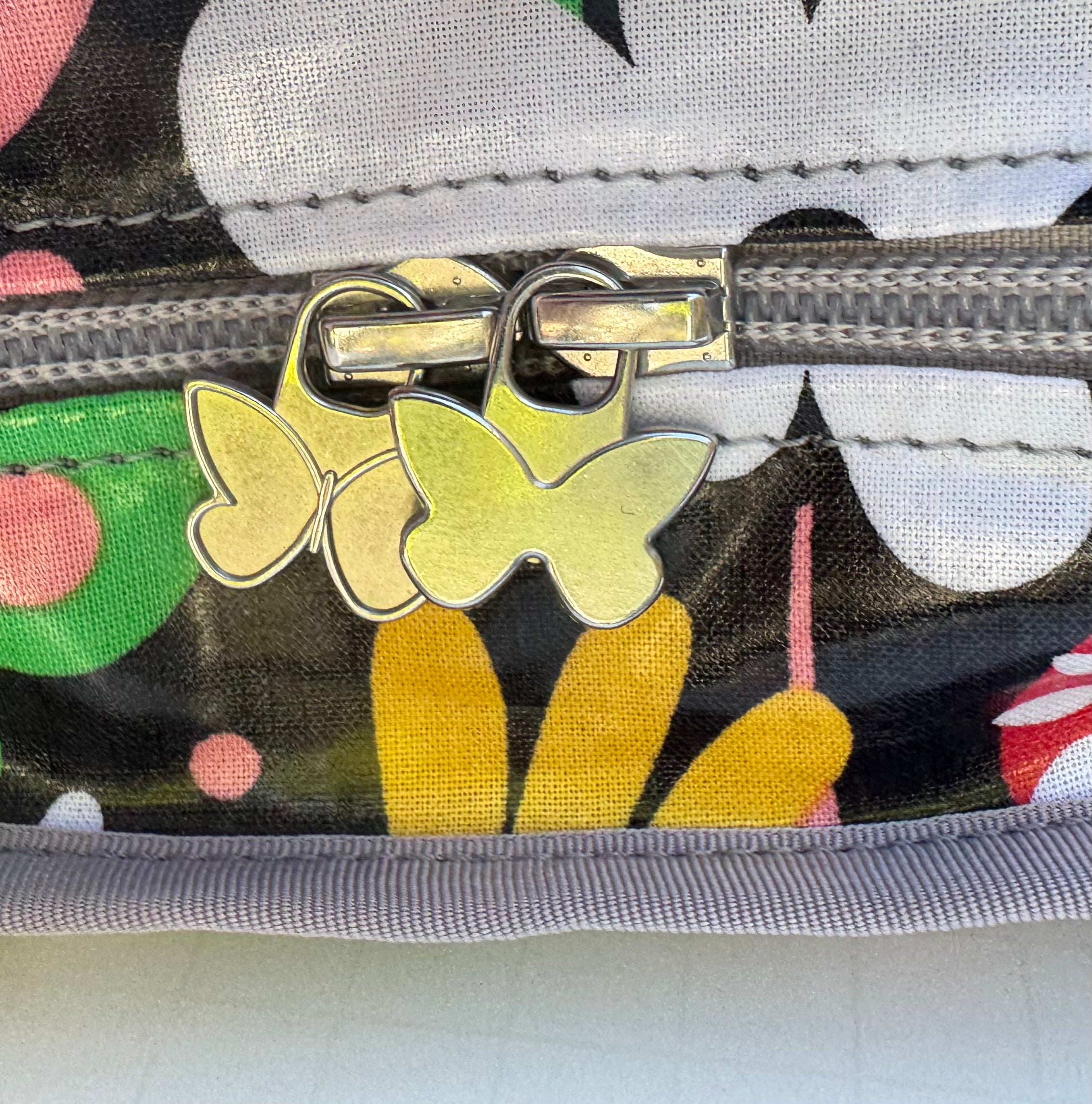 Slicker fabric lines the outside AND inside of our hanging toiletry bag. The sturdy nylon handles are reinforced on the inside to help support the weight of all your products. There is a large pocket panel for full sized shampoo, conditioner and lotions with two smaller pocket panels for face creams, foundations and brushes. We also created a special removable inner pouch has four separate pockets perfect for cosmetics or smaller tubes. (Replacements for removable inner pouches available for purchase separately).